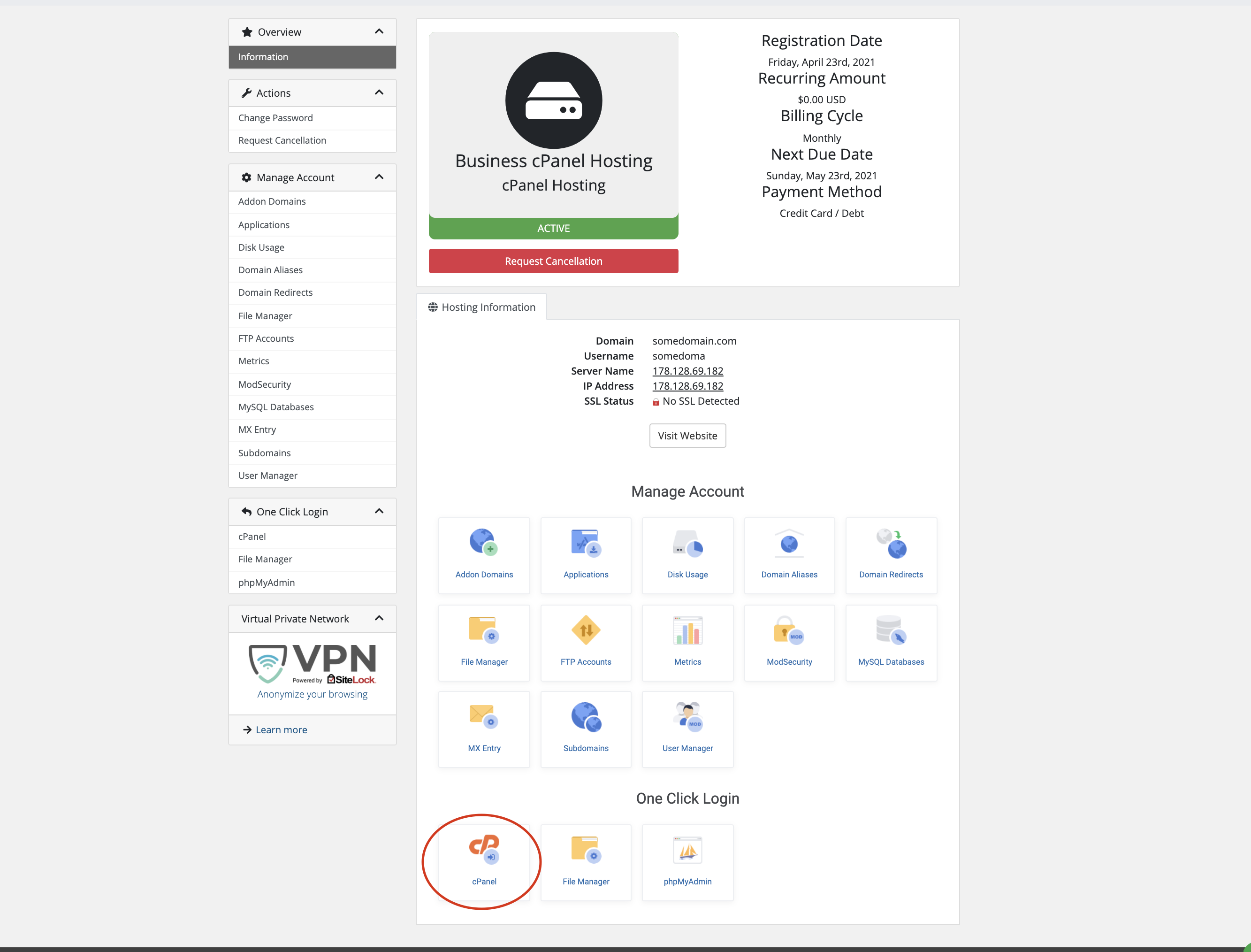 Inside your "Product Details" section, you will find cPanel options. If you wish to land inside cPanel itself, click the cPanel icon under "One Click Options"